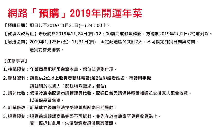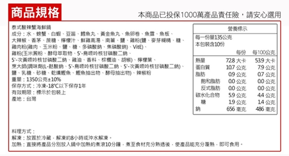 商品規格: 品名:預購《柴米夫妻》泰式酸辣蟹海鮮鍋(三點蟹2隻) 成份:詳見內文 重量:詳見內文 保存方式:冷凍-18℃以下保存1年 有效期限:標示於包裝上 產地:台灣 產品責任險 已投保1000萬產品責任險,請安心選用 商品規格 品牌 : 柴米夫妻 種類 : 火鍋/鍋物 主要食材 : 海鮮水產 風味 : 東南亞 口味 : 辣味 份數/規格 : 泰式酸辣蟹海鮮鍋(三點蟹2隻) 保存方式 : 冷凍-18℃以下 保存期限 : 冷凍-18℃以下保存1年 廠商名稱 : 家庭億得行銷股份有限公司 廠商地址 : 台北市大安區忠孝東路4段218號13樓 投保產品責任險字號 : 0500字第18AML0001182號 食品業者登錄字號 : 家庭億得A-150792822-00000-3 產地 : 台灣 體驗說明 使用方法說明 無 注意事項 【預購日期】即日起至2019年1月21日(一) 24:00止。 【款項入款截止】最晚請於2019年1月24日(四) 12:00前完成款項確認,方能於2019年2月2日(六)前到貨。 【配送區間】2019年1月25日(五)~1月31日(四),固定配送區間共計7天,不可指定到貨日期與時間,送貨前會先聯繫。 【注意事項】 1. 接單限制:年菜商品配送限台灣本島,恕無法貨到付現。 2. 聯絡資料:請提供2位以上收貨者聯絡電話(第2位聯絡者姓名、市話與手機,請註明收貨人「配送特殊需求」欄位) 3. 請勿代收:低溫冷凍宅配請勿請管理員代收,配送日當天請保持電話暢通並安排家人配合收貨,以確保品質無虞。 4. 訂單修改:訂單成立後恕無法接受地址與配送日期異動。 5. 退貨限制:退貨前請確認商品完整不可拆封,並先存於冷凍庫至貨運收貨為止。若一經拆封食用、失溫變質者須償還其價額。